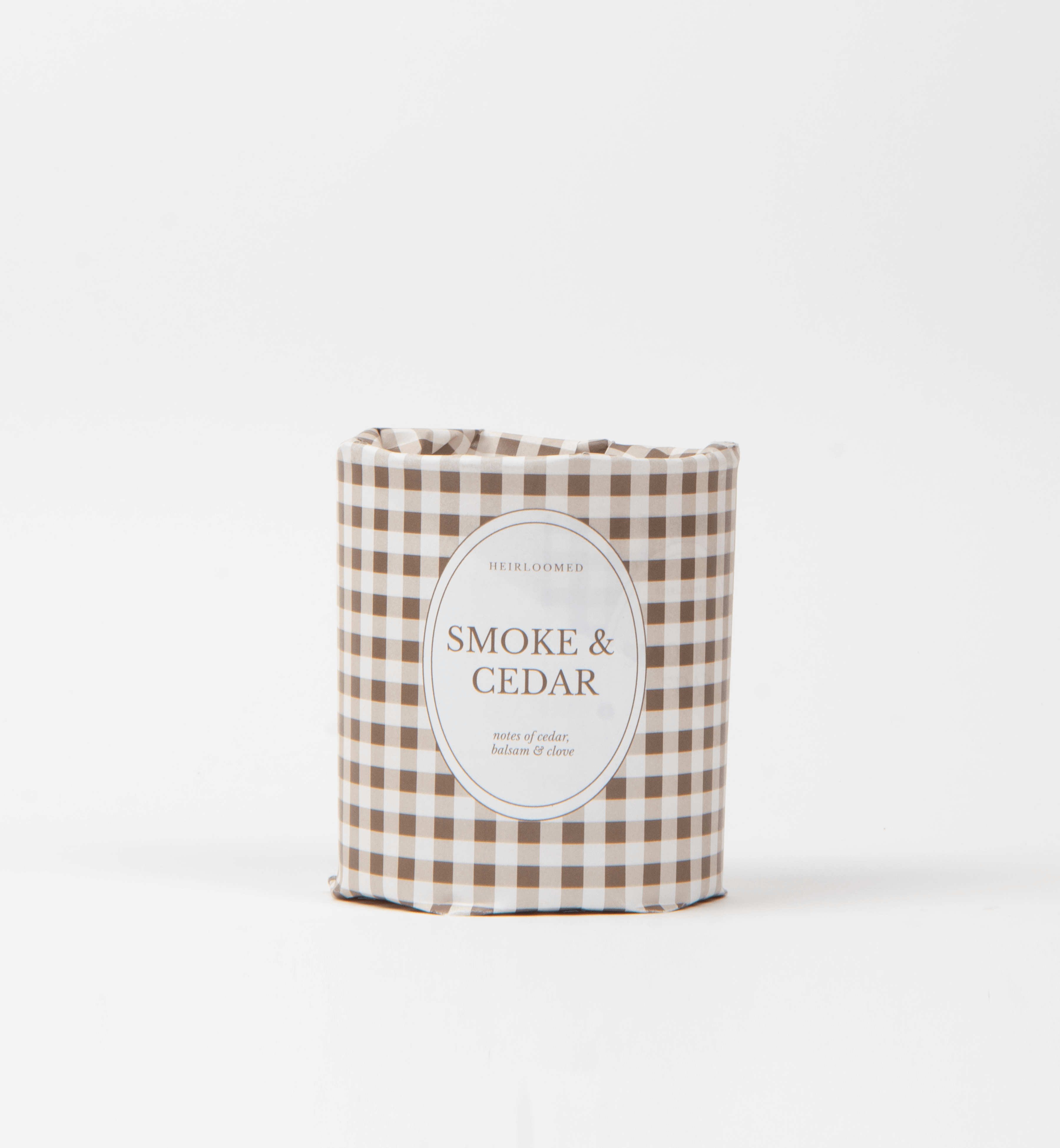 Indulge in the luxurious scent of our Fall Candle - Smoke & Cedar, part of our exclusive Heirloomed Collection. This candle features our signature custom fragrance, expertly blended with notes of cedar, balsam, and clove for the perfect nostalgic woodsmoke fireplace aroma. Each 8 oz candle is hand-poured in our Atlanta studio using 100% soy wax and a cotton wick, providing over 50 hours of clean and long-lasting burn time. The elegant design includes a straight-sided glass jar, a sophisticated tobacco brown mini gingham check pattern, and a minimalist upscale textured label for a touch of artistry. Elevate your space with this exquisite candle, carefully wrapped in our custom-designed packaging.