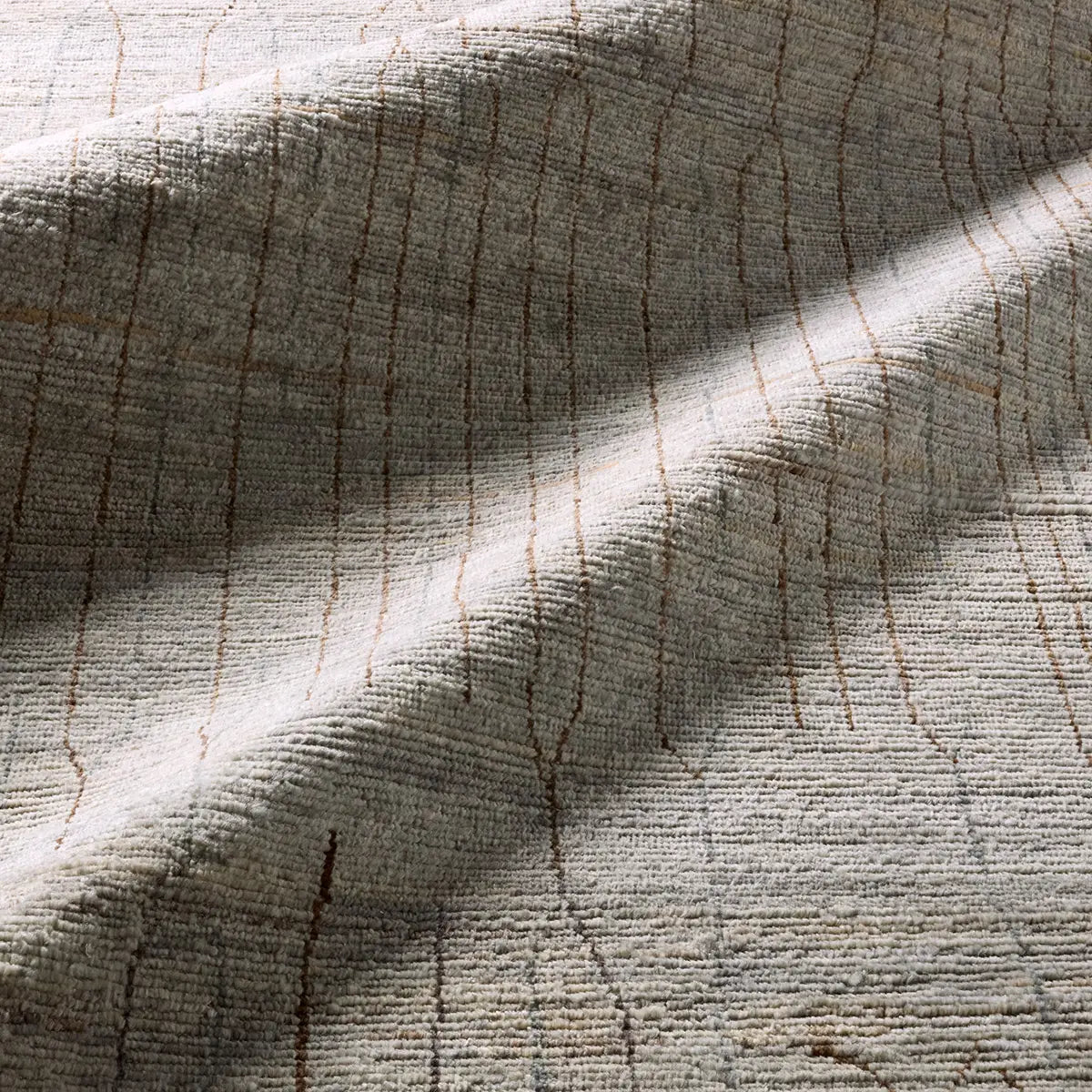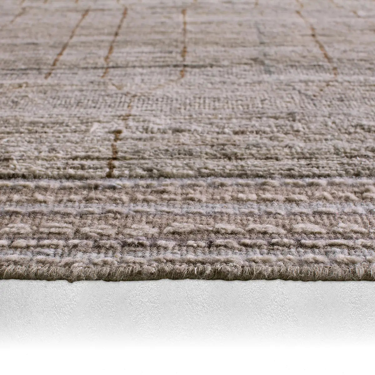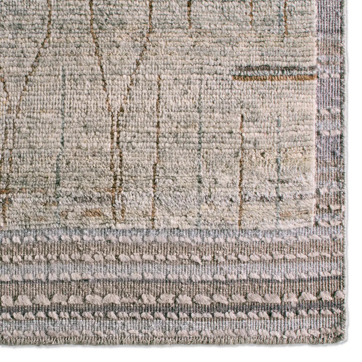 Full of texture, the handknotted Kazben collection stuns with modern Moroccan patterns in natural hues. The Atalaya design delights with a gray and brown abstract-linear pattern on a cream base. A dotted border adds the finishing touches to this elevated accent piece. Low, ribbed pile creates visual intrigue and grounds any contemporary space.