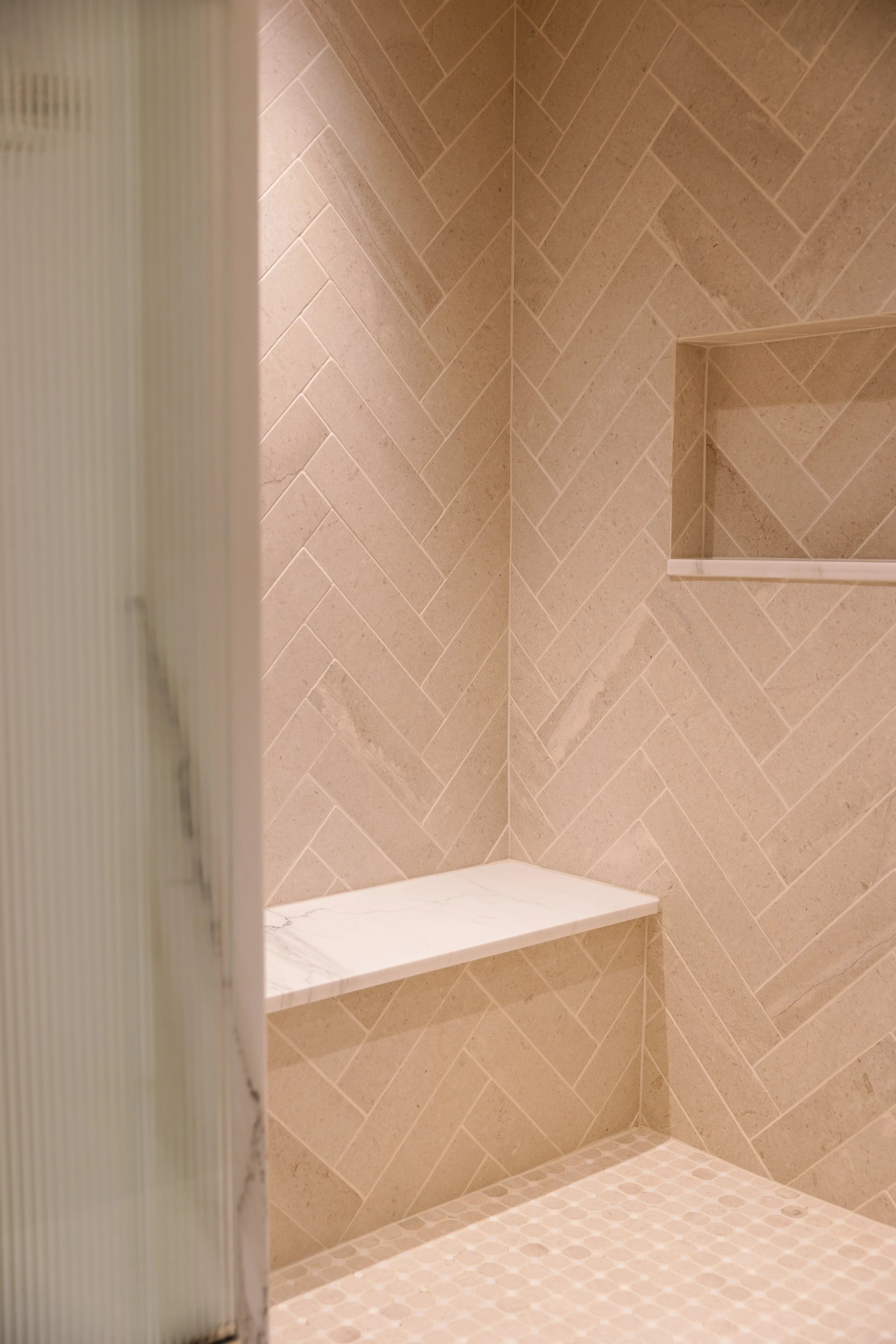 Sierra has a cream color background with fossil like veining throughout.