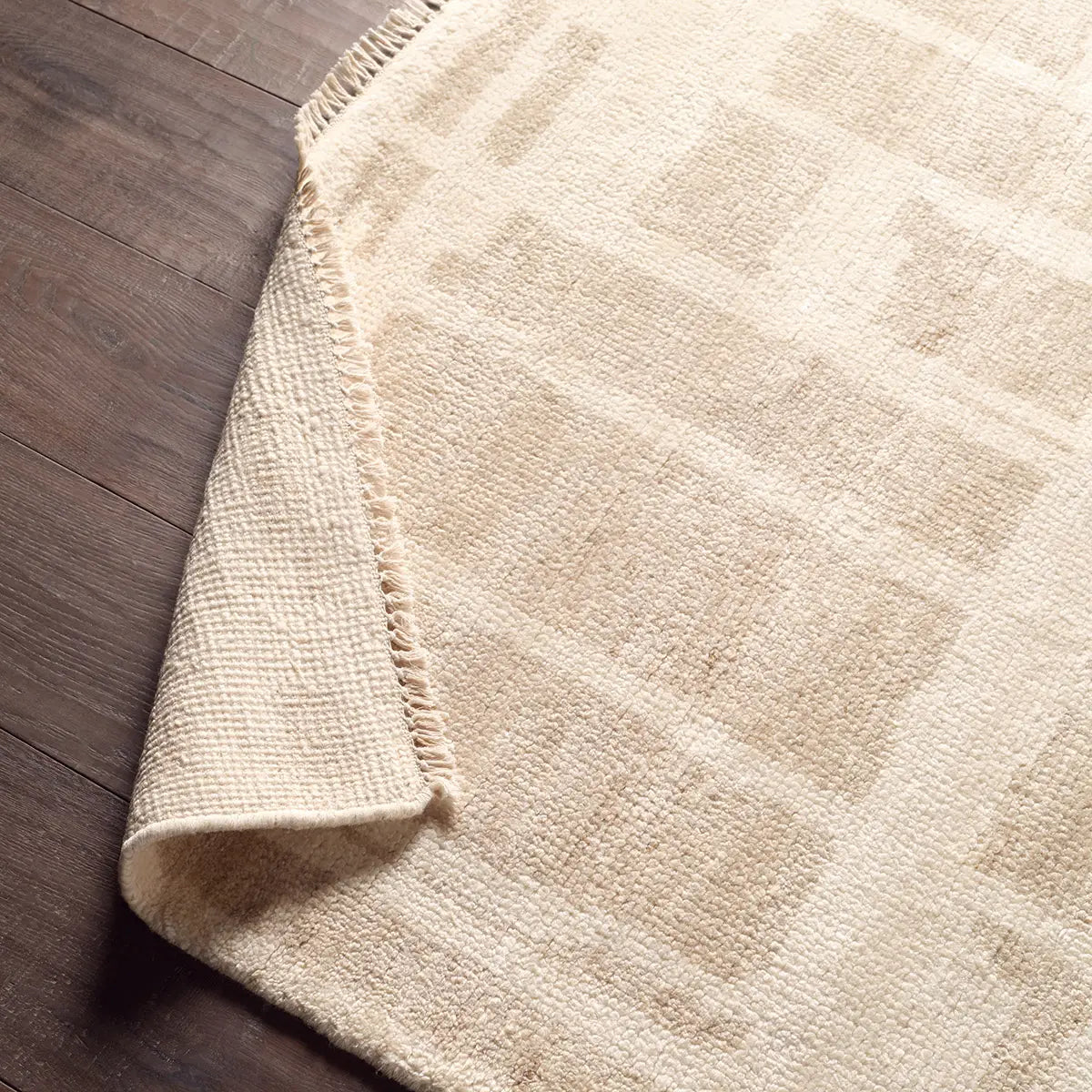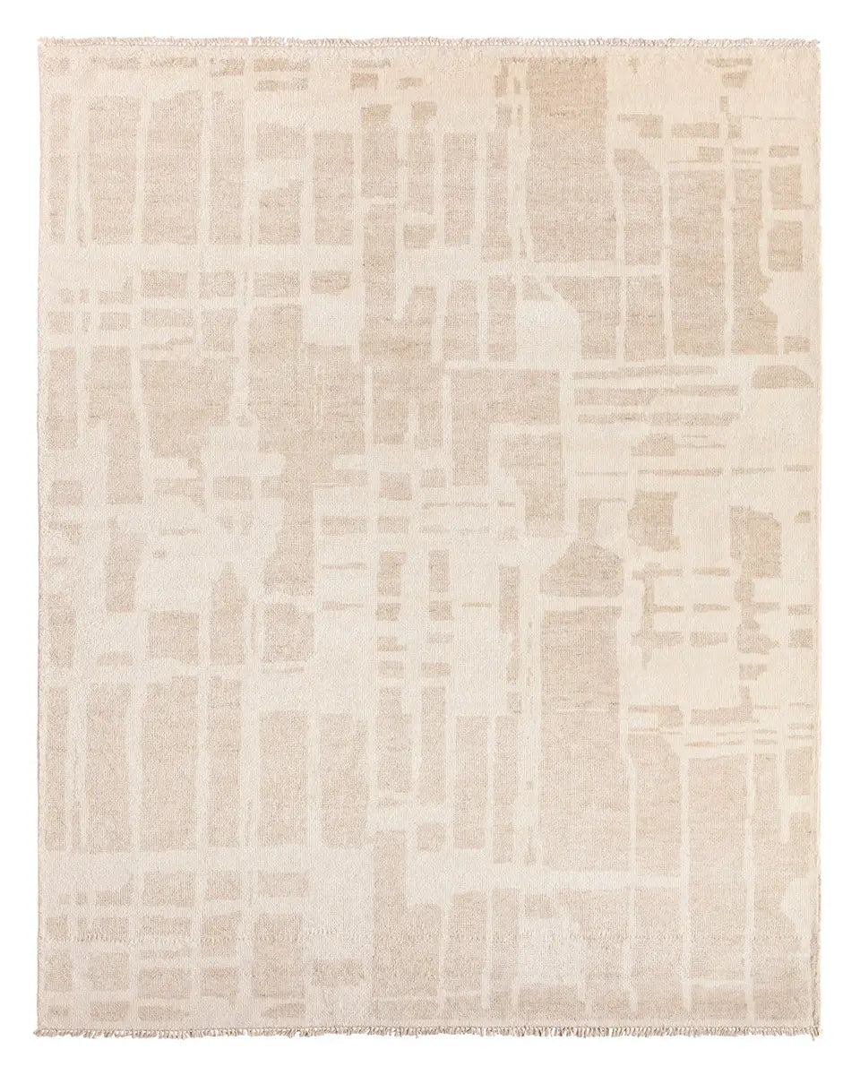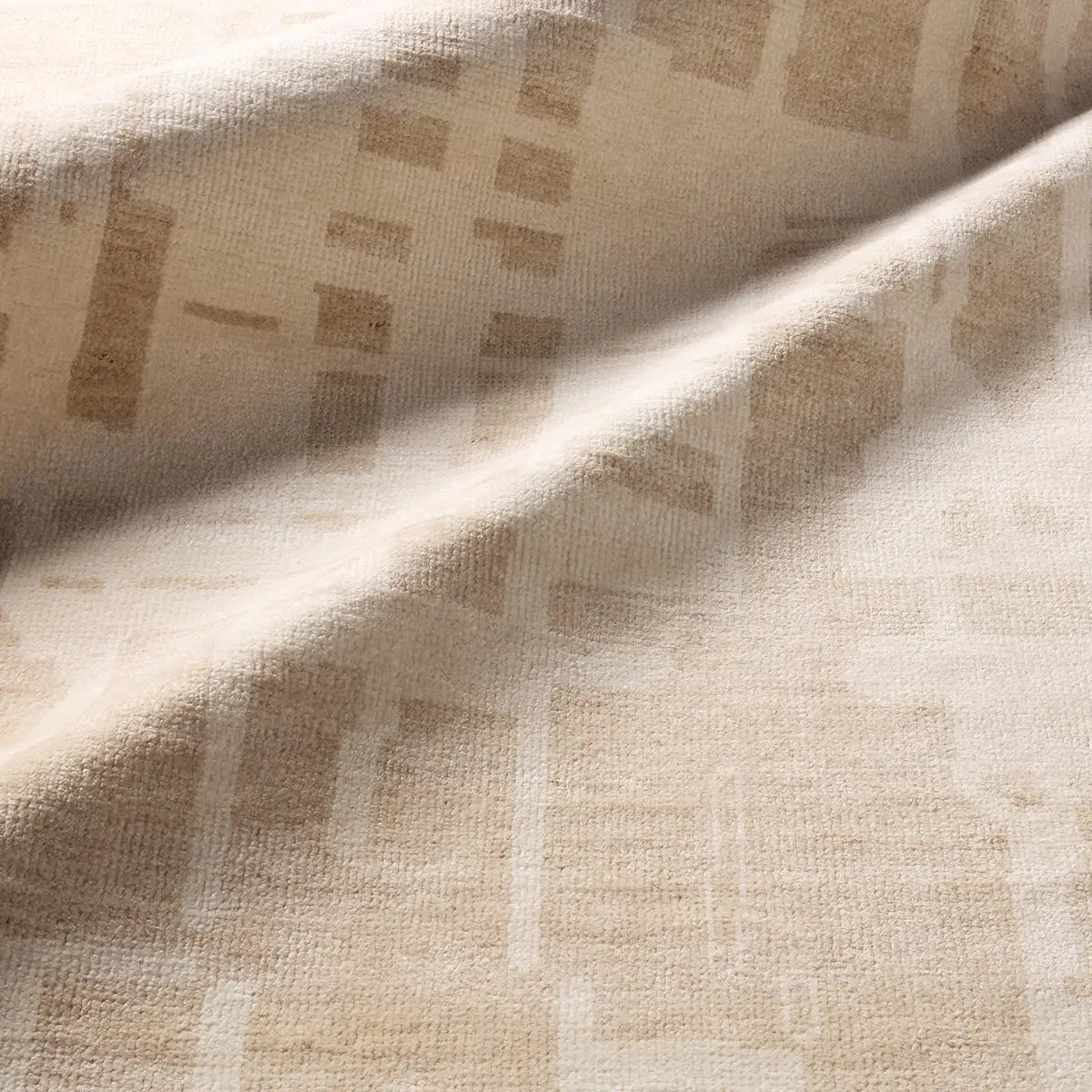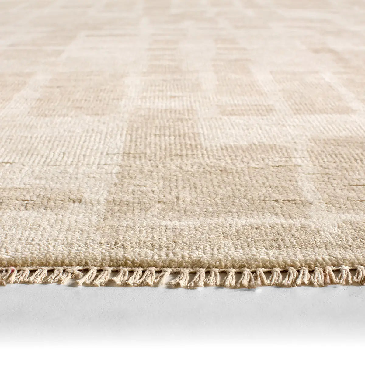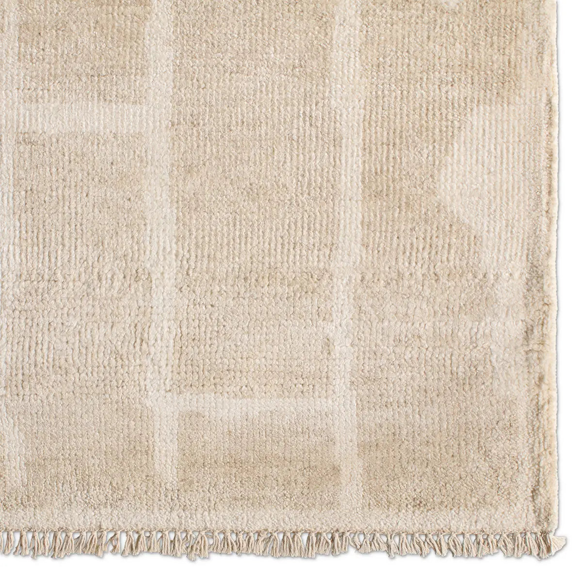 Hand carded wool, soft Tencel, and a neutral color palette define the handknotted Ashend collection. The Airme rug showcases a Moroccan-inspired abstract motif in a neutral, cream, taupe, and beige colorway. Short, cream fringe adds to the global charm while the lustrous sheen establishes an elevated look. This accent piece provides comfort underfoot while adding texture to low traffic spaces of the home such as bedrooms, formal living areas, formal dining areas, and sitting rooms. Expertly handcrafted in India, this rug is certified by both Nest and RugMark, assuring ethical luxury.