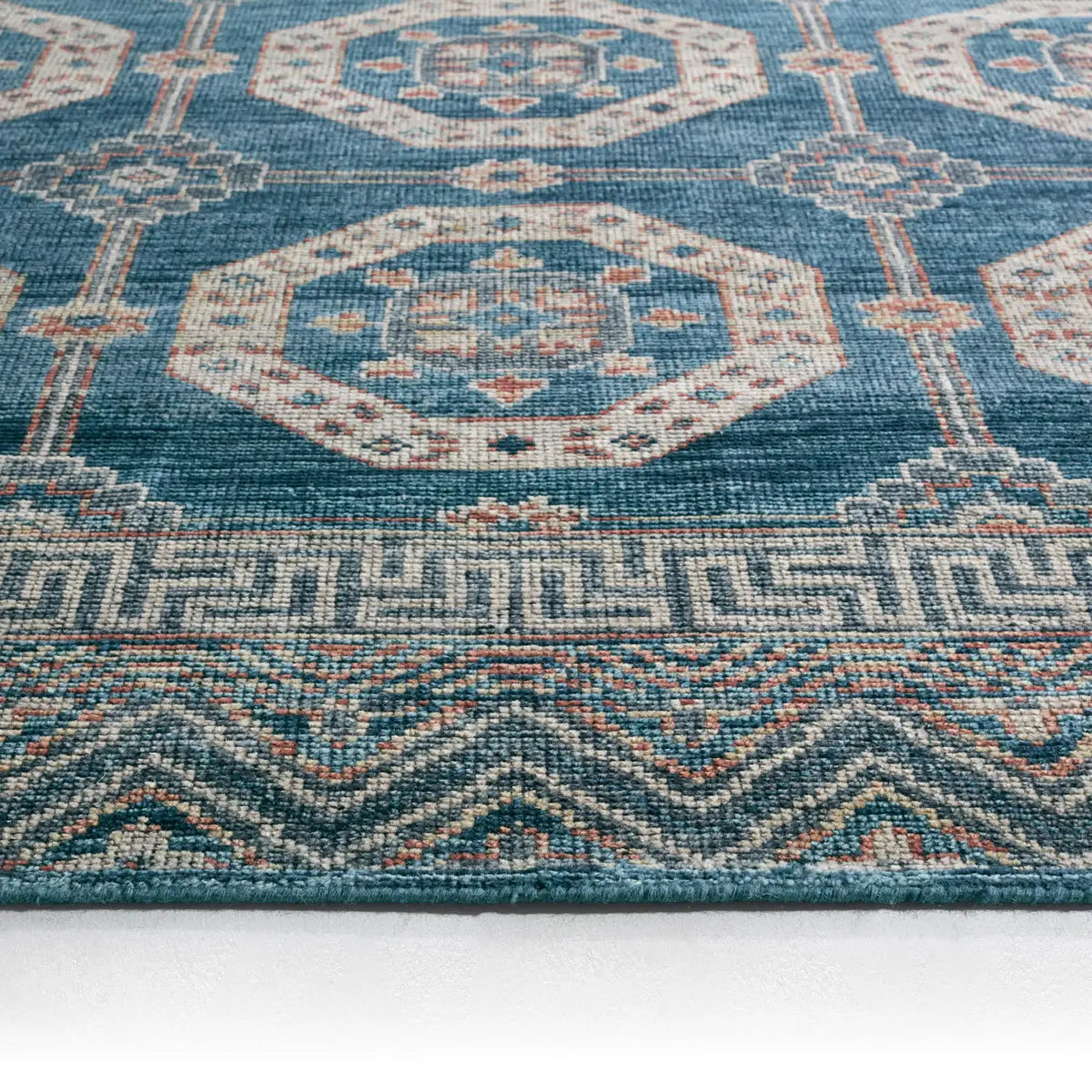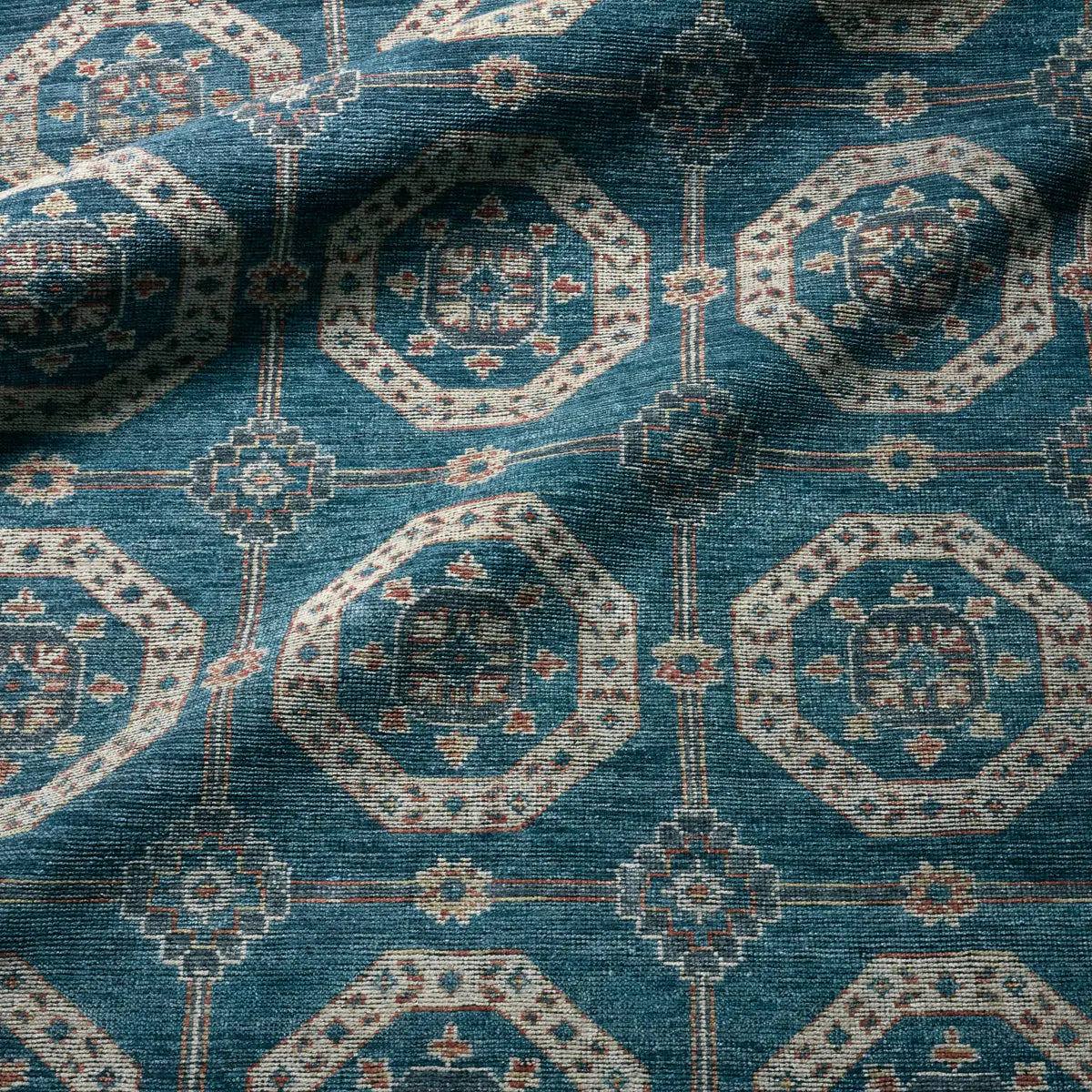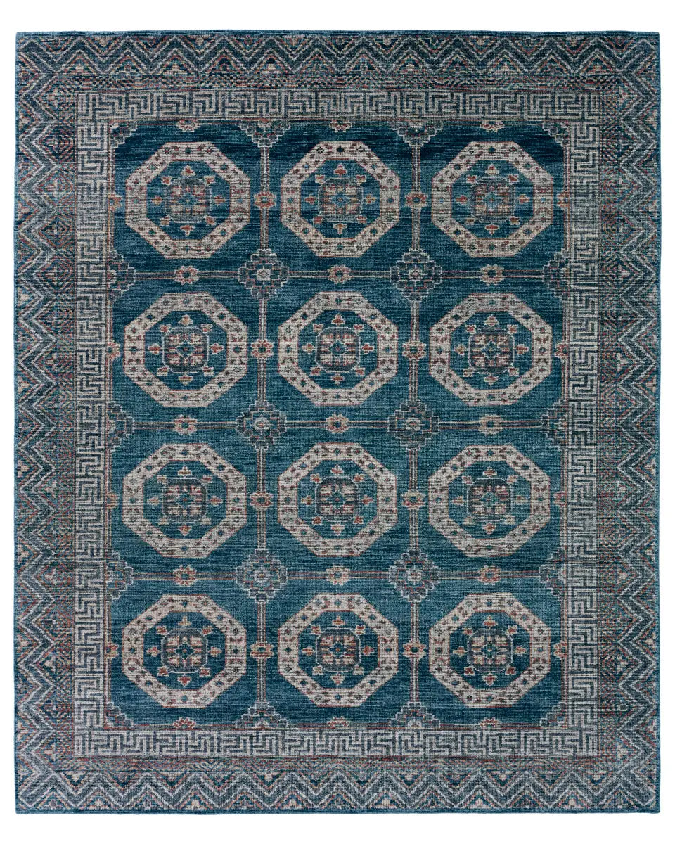 The Rhapsody collection features heirloom-quality designs of stunningly abrashed Old World patterns. The Gideon area rug boasts beautifully washed pendants with a decorative border detail. The deep blue palette is accented with cream hues and red tile patterns for added depth and intrigue. Durable and exquisitely made, this hand knotted wool rug anchors living spaces with a fresh take on vintage style.