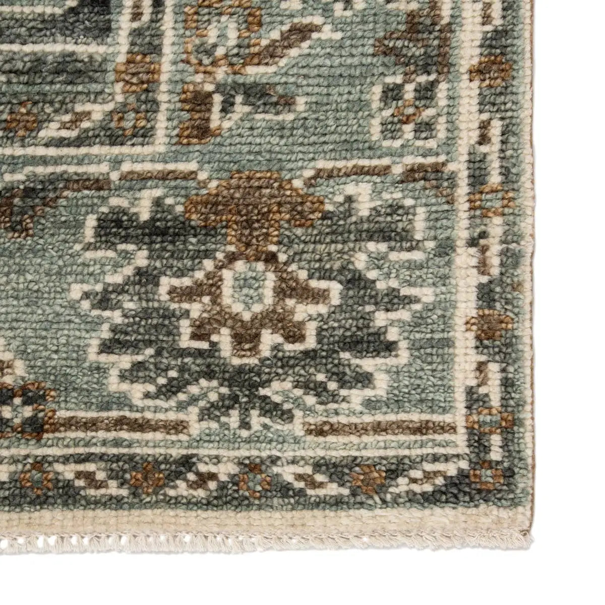 The Salinas collection is punctuated by traditional, intricate details and a soft, hand-knotted wool construction. The elegant Slayton rug makes a transitional statement with grounding hues and scrolling, vintage motifs. This durable, artisan-made rug features floral accents in a serene blue-green, cream, and bronze colorway.