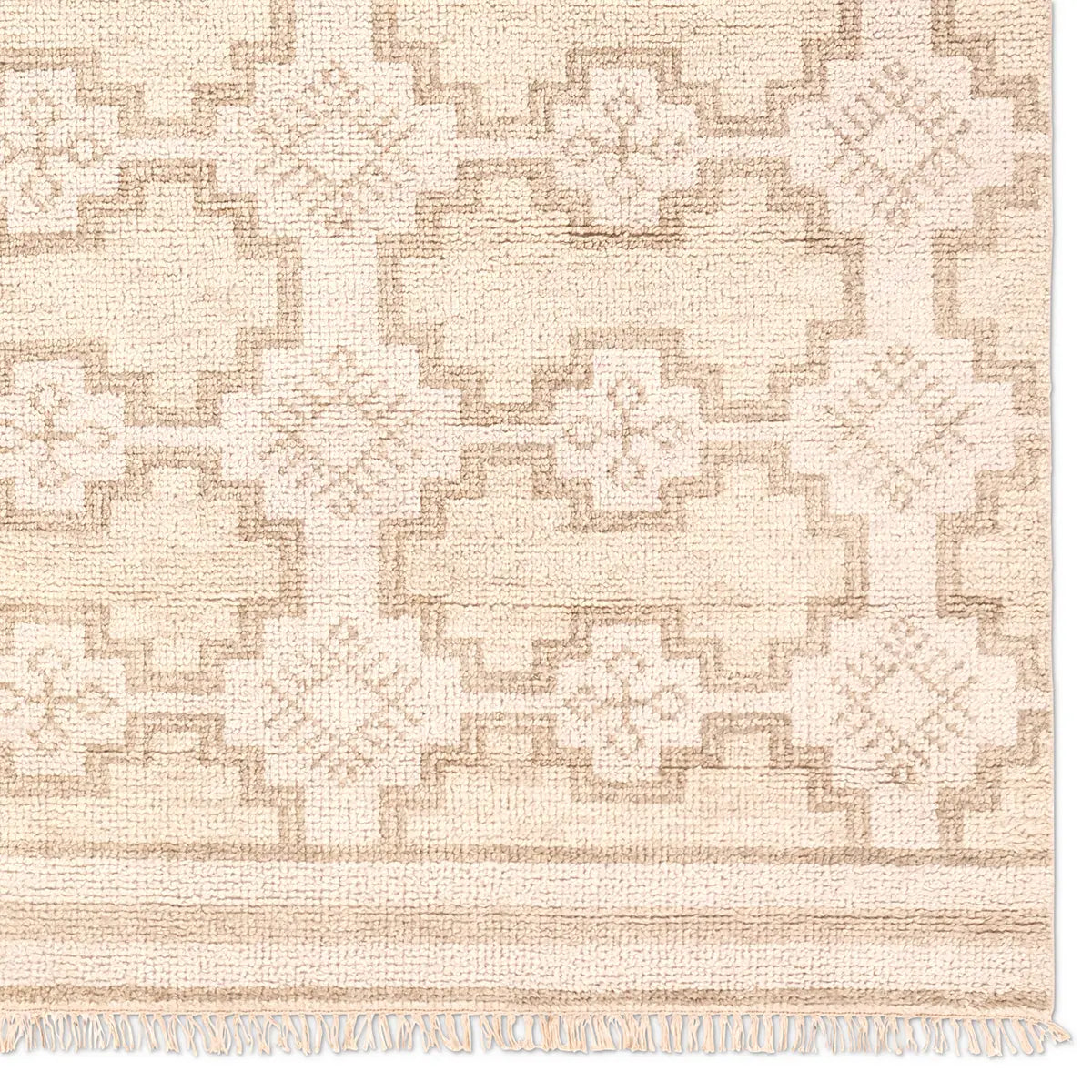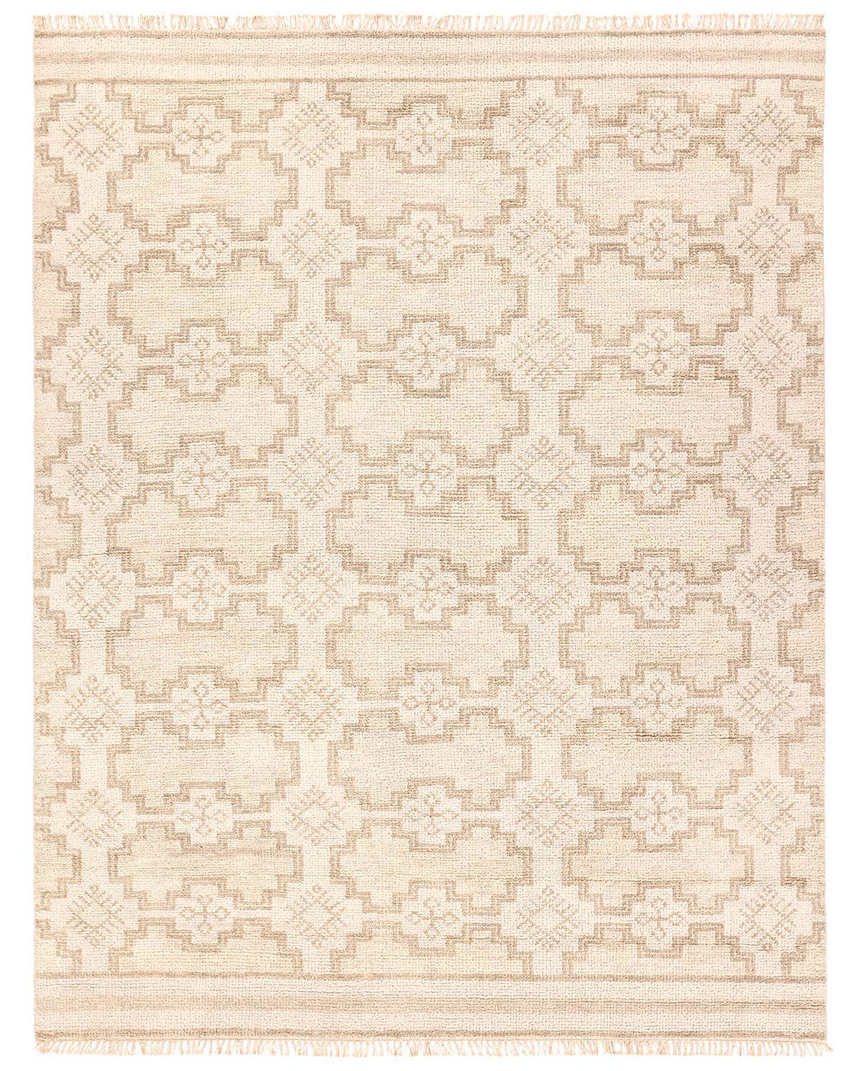 The Sevak collection skillfully emulates vintage designs with the simplified and tonal twist of modernity mixed into the motifs. These Kars-inspired patterns have the uncanny ability to both ground a space with inviting and comfortable appeal, while also lending the perfect amount of interest to a room. The Elmast design showcases a geometric tile pattern with a border and fringe to match. The beige and cream colorway establishes the global, vintage style. Naturally stain-resistant, the 100% wool pile is soft underfoot and easy to clean while maintaining effortless sophistication. Obtaining both a Nest Seal and RugMark certification, this global area rug brings ethical, handmade luxury to the home.