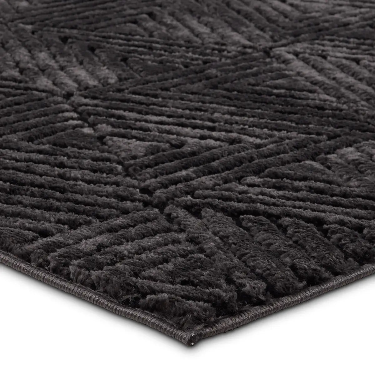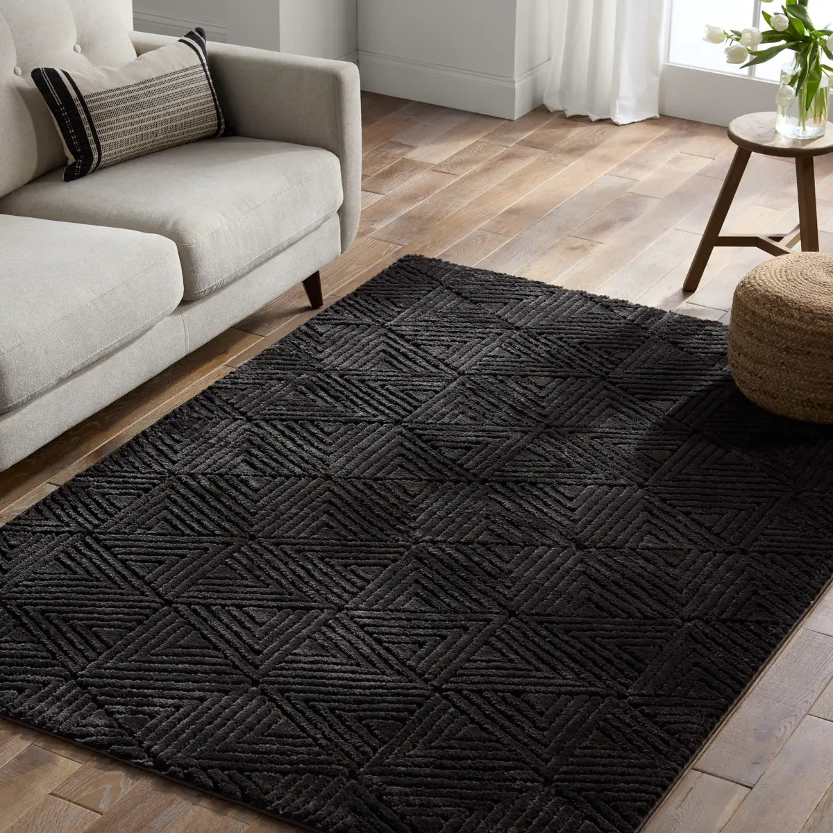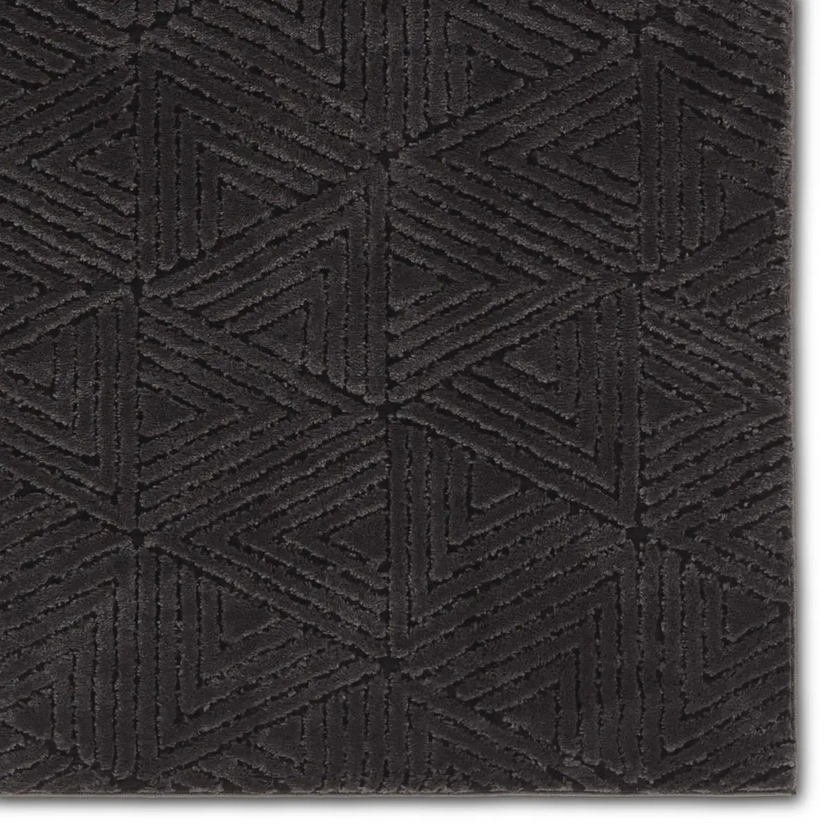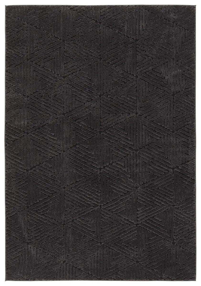 Modern geometrics and a lustrous sheen define the Calix Collection by Nikki Chu. The soft, plush pile features high and low areas for added texture that delights underfoot. The Ziazan design showcases a black, geometric, triangle pattern. Polypropylene and polyester blend provides natural stain resistance and low maintenance care. This rug best suits medium-traffic spaces of the home, such as living rooms, bedrooms, and dining rooms.