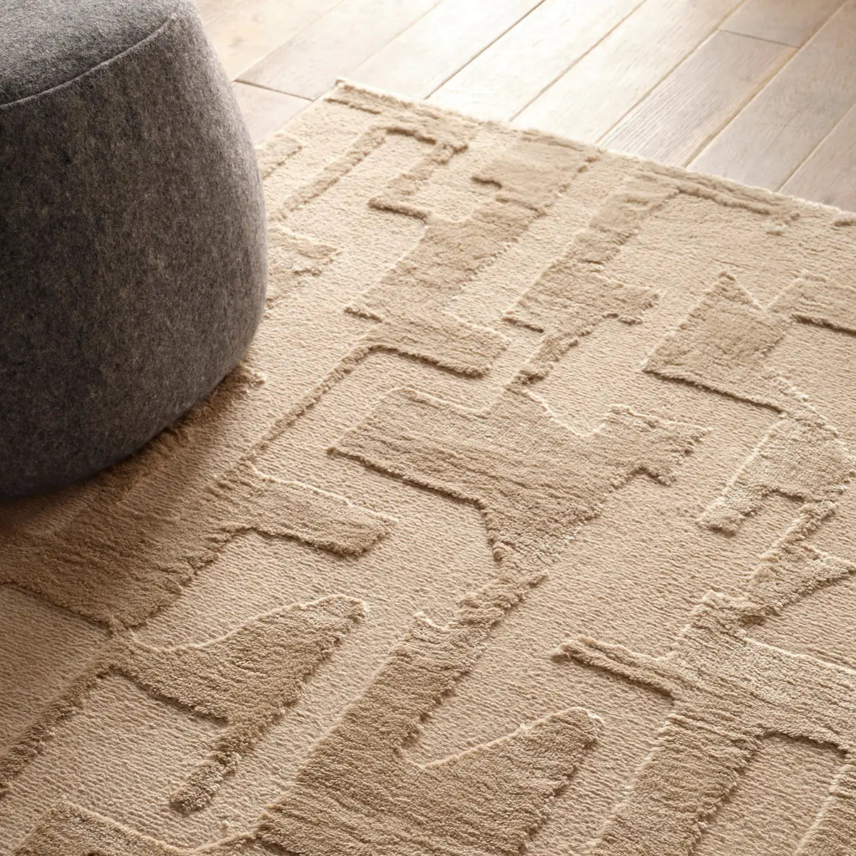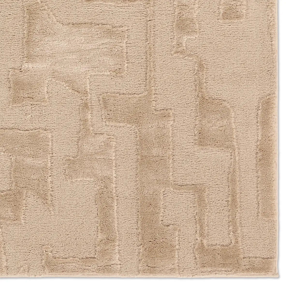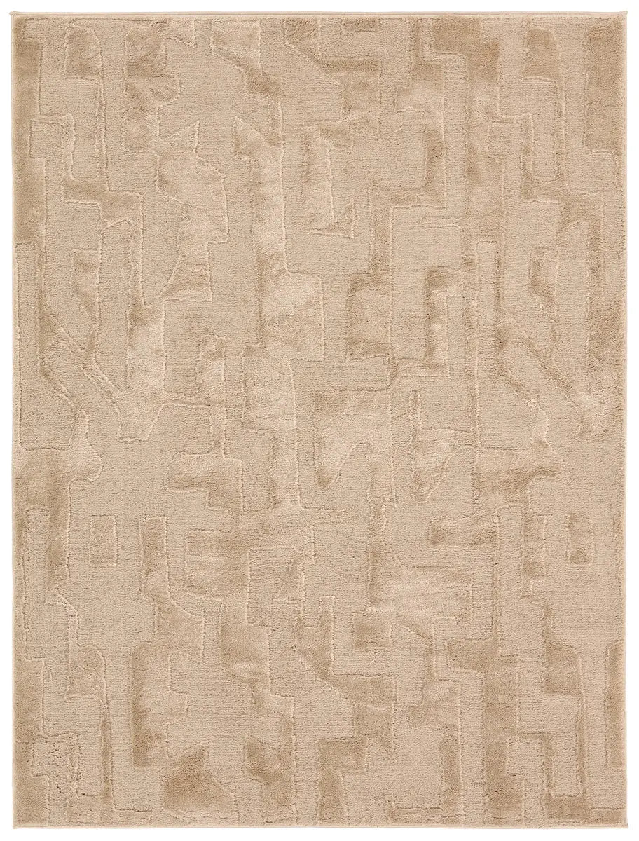 Modern geometrics and a lustrous sheen define the Calix Collection by Nikki Chu. The soft, plush pile features high and low areas for added texture that delights underfoot. The Demir design showcases a tan/taupe Brutal geometric pattern, exuding modern elegance. Crafted from a durable blend with natural stain resistance, it effortlessly combines style and practicality.