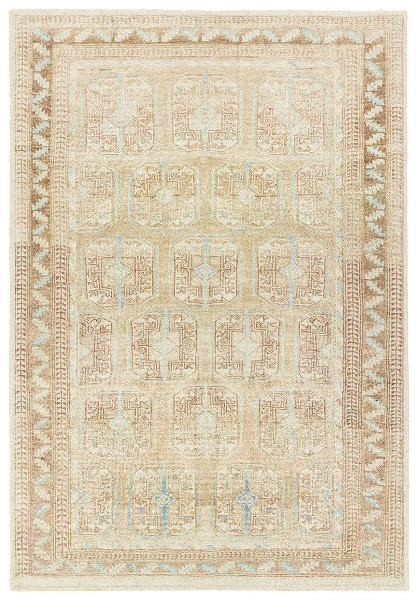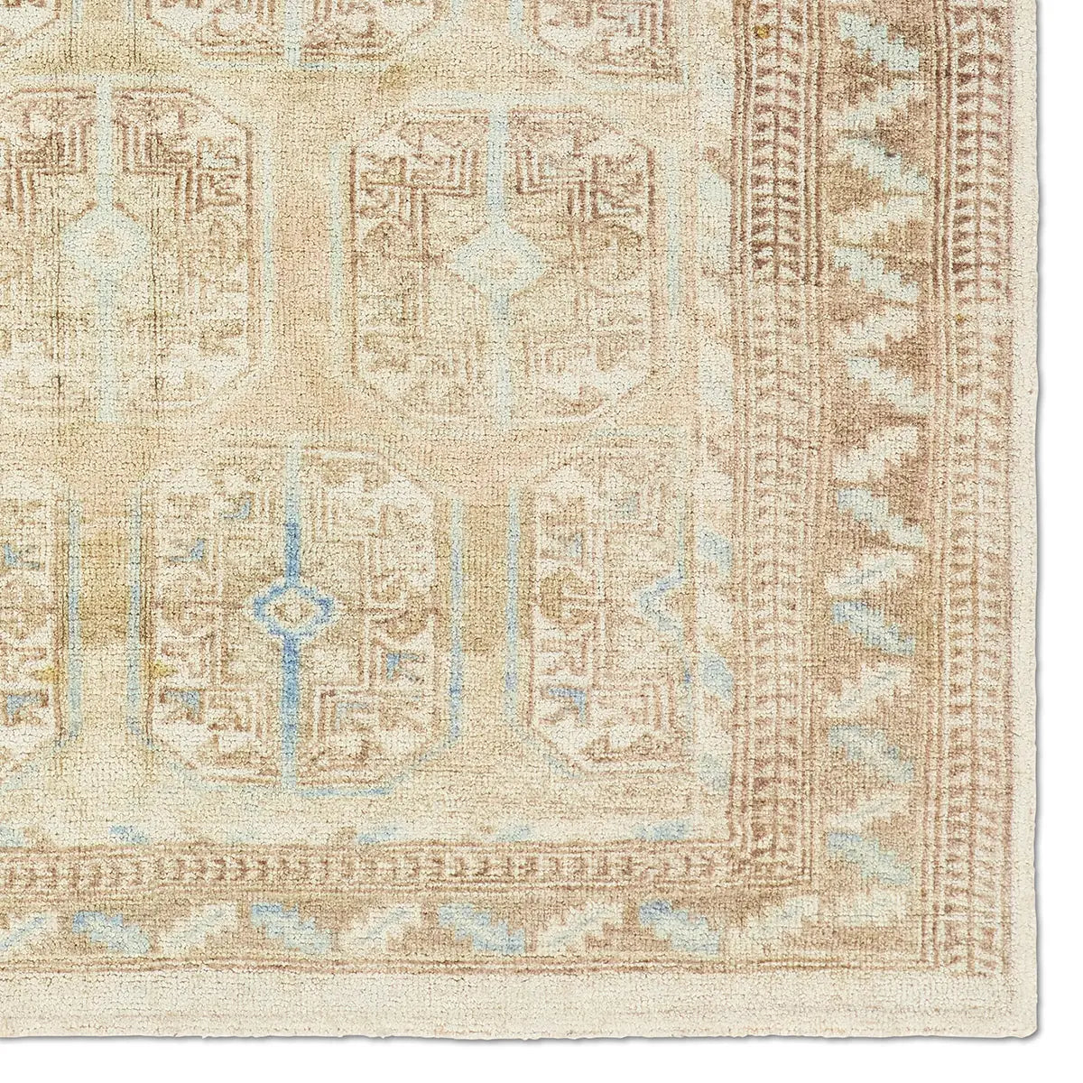 The Magnus design features a traditional pattern of small medallions set against a warm tan and beige backdrop, highlighted by subtle blue accents. Its vintage, distressed finish adds character and charm, making it feel like a treasured heirloom from the very first step.
