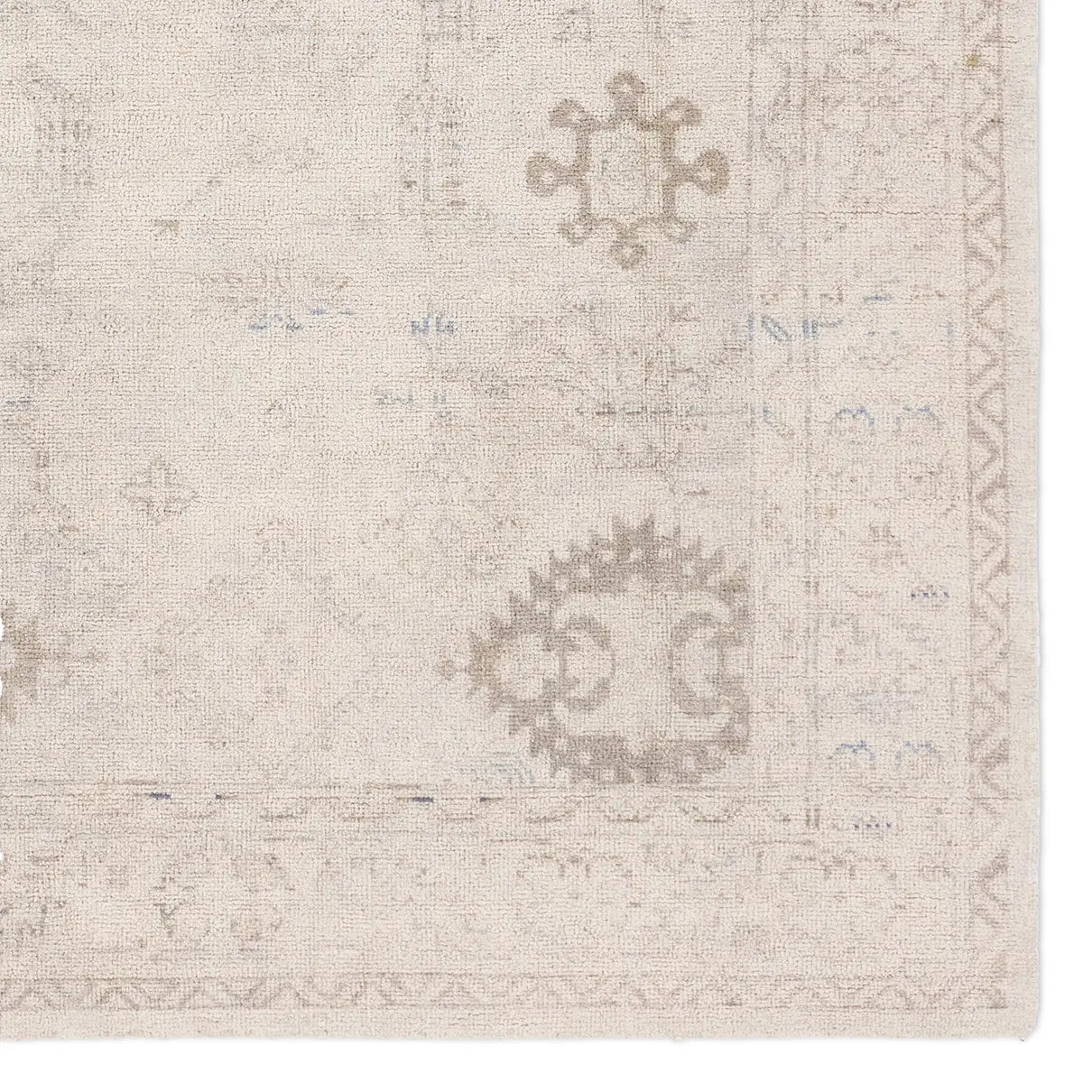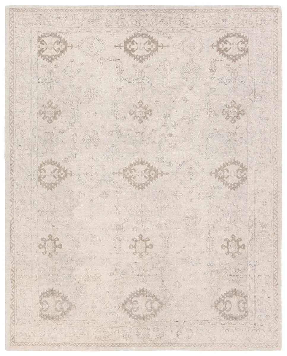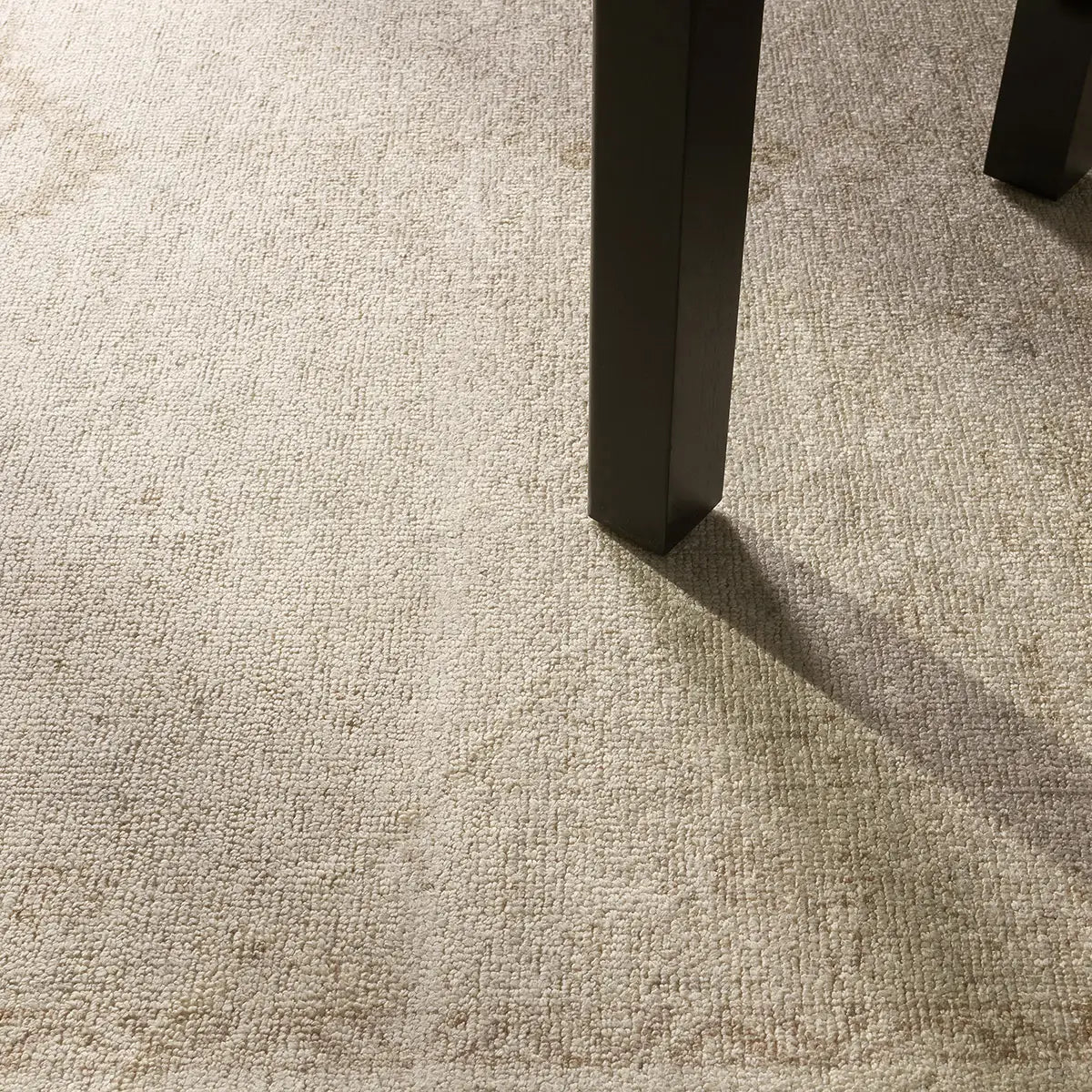 The Saffron design features a traditional pattern of small medallions, set against a warm tan and beige backdrop with subtle tan accents. Its vintage, distressed look adds character and charm, making it feel like a cherished heirloom from the very first step.